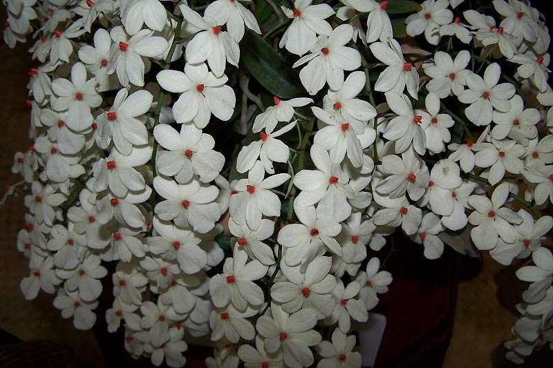 - Flores estreladas, geralmente brancas, creme ou levemente esverdeadas.