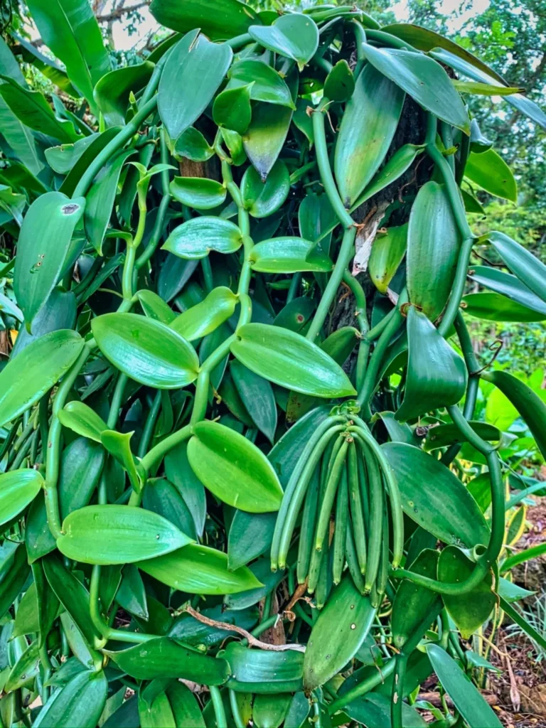 - Fruto: vagens longas e finas, chamadas popularmente de “favas de baunilha”.